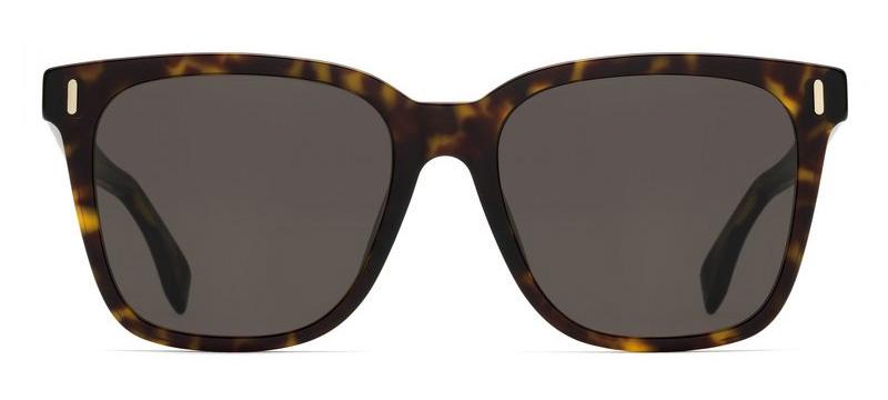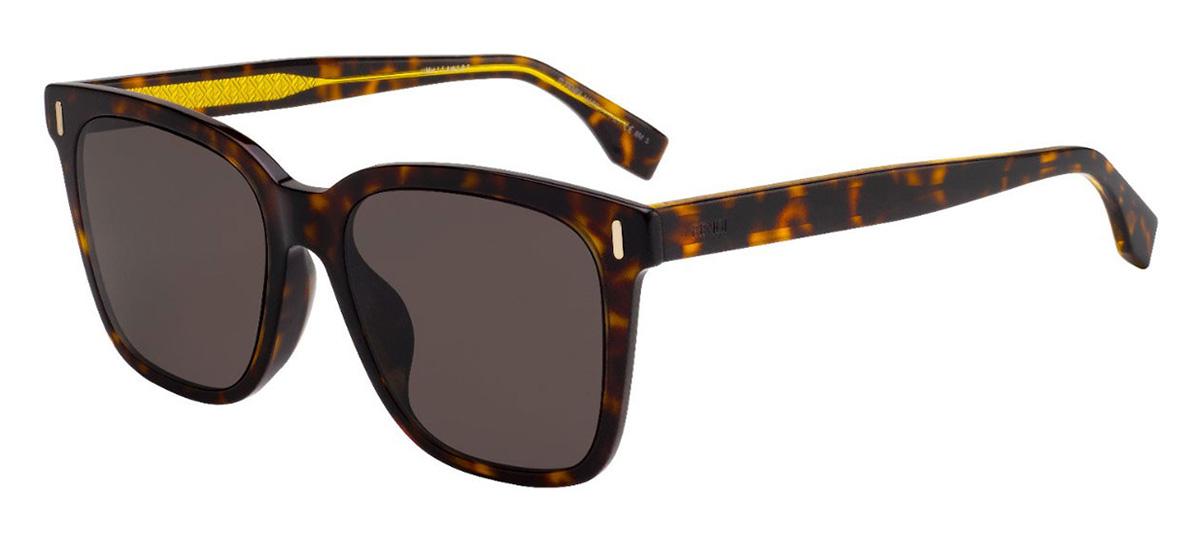 Моему мужчине мы выбрали модель FF M0053/F/S 086 IR в квадратной оправе схожей расцветки из легкого и прочного ацетата «Гавана», но с более сдержанными дужками с вертикальными заклепками и гравировкой Fendi, однотонными серыми линзами. На внутренней стороне дужки расположен золотистый логотип FF.